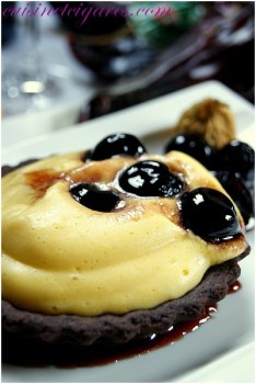 Les tartelettes cacao aux cerises au Piment d’Espelette, sabayon au Miel et Muscat et ses figues en habit de chocolat pimenté de Sandrine du blog Cuisine et Cigares