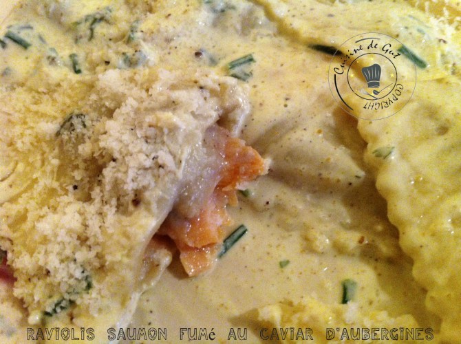 Published at 1200 × 896 in Raviolis saumon fumé et caviar d’aubergine