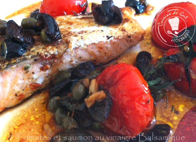 Published at 1200 × 872 in Tomates et saumon balsamiques à la plancha