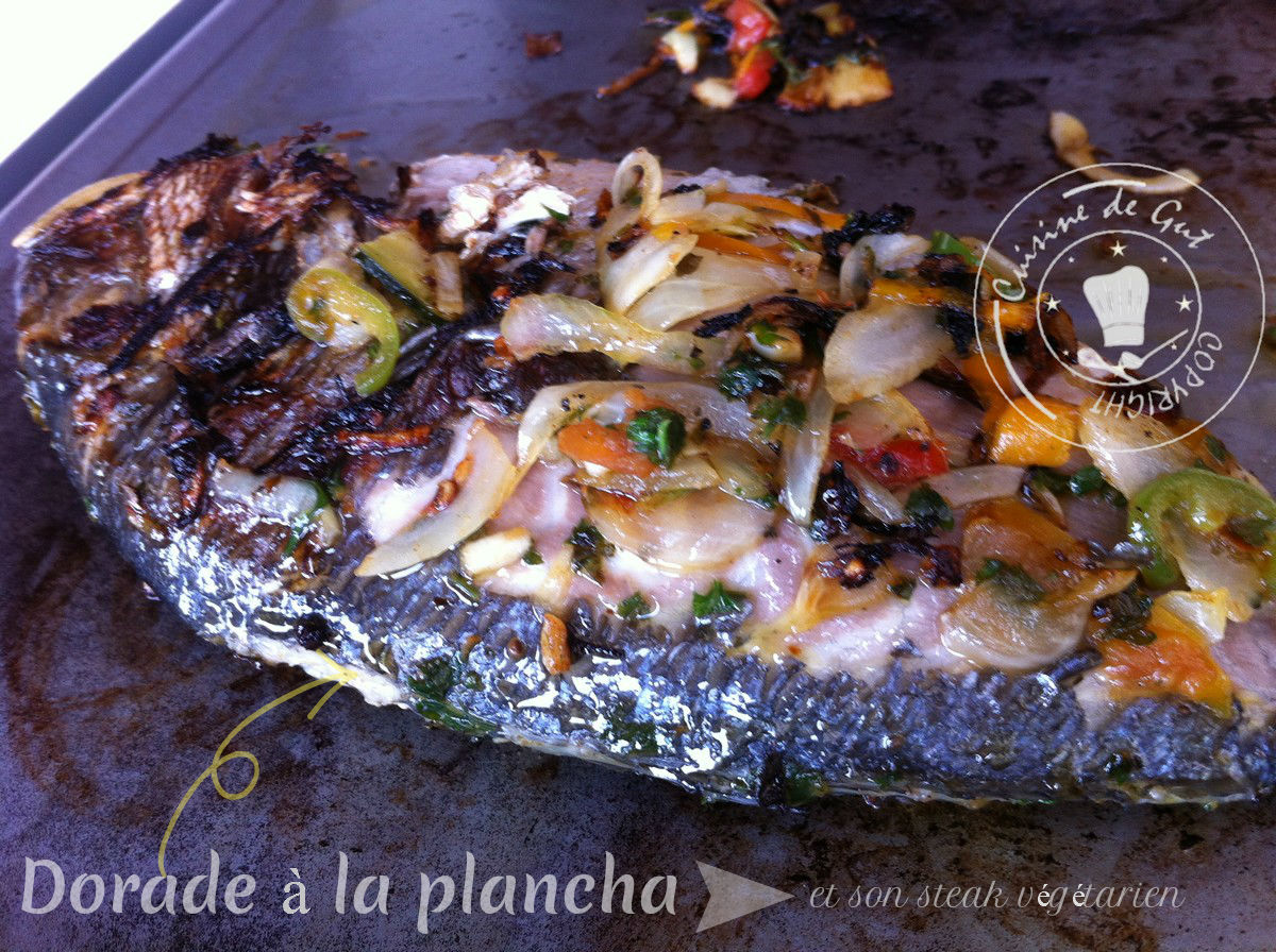 Published at 1200 × 896 in Dorade à la plancha et son steak végétarien