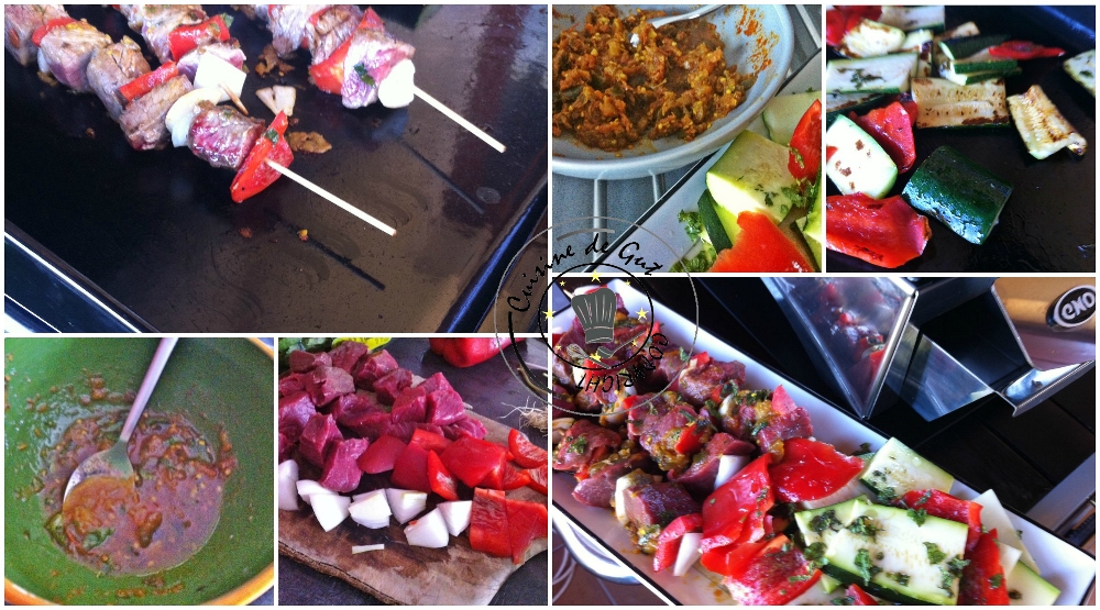 Je dois dire que la semaine passée pour les vacances de mes petites filles, nous avons eu beaucoup de chance ! Nous avons eu un temps merveilleux pour la saison. Entre 23° et 26° c !! De quoi manger dehors et se faire une petite plancha, toujours bien sûr sur ma Plancha®ENO !!  Du coup je vous propose aujourd’hui des brochettes de bœufs que j’ai fait mariner dans une zaalouk dans laquelle j’ai ajouté de la menthe ! (je n’en ai plus dans mon jardin mais j’ai la chance de pouvoir en trouver) le tout accompagné de courgettes et de poivrons ! Qu’est ce que nous nous sommes régalés !! Que c’est agréable tout de même de pouvoir continuer de me servir de ma plancha en cette saison !! je suis ravie !!