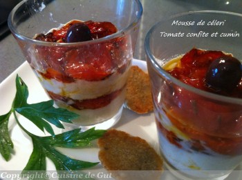 Mousse de céleri, tomates confites et cumin