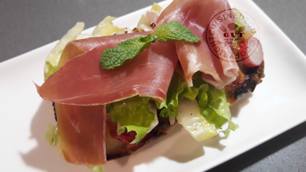 Bruschetta endives avocat radis tomates confites et mozza