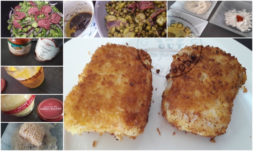 Je trouve qu’il y a un bon petit moment que je ne vous ai pas proposé de recette de poisson vous ne trouvez pas ? Il suffit de demander, en voici une ! C’est un peu grâce à Anne du joli blog Happy cooking que je l’ai réalisée car la newletter de cette recette m’attendait dans ma boite mail lorsque je suis rentrée à la maison Il s’agissait d’une recette de joues de lotte panées à la purée de petits pois. Anne ne publie pas très souvent mais quand elle le fais je salive !!  Je rentrais de vacances et mes courses n’étant toujours pas faites, puisque je n’étais arrivée que la veille, je n’avais donc rien de frais à ma disposition. C’est dans ce cas là que l’on dit merci à son congélo. Il me restait un fond de sac de petits pois (pas suffisamment pour faire une purée, mais parfait pour le terminer) et j’avais des fèves. Du coup je les ai associées à un reste de saucisson au jambon (congelé également) et un oignon rouge. Comme il me restait de la marinade de ma dernière plancha, j’ai décidé que nous allions les manger froids en salade en m’en servant comme vinaigrette (je la fais d’ailleurs très souvent pour arroser des légumes cuits). Je n’avais par contre pas de joues de lotte, mais un bon cabillaud que j’ai fait paner avec du piment d’espelette et des Epices de cajun mélangés dans ma farine. Comme petite sauce pur déguster ce poisson, j’ai mélangé un fromage blanc à 0% avec un peu de rouille et de la moutarde ramenée de Collonges à Rouge au citron vert ! Tout ceci peut vous paraître un peu curieux, je le conviens mais je vous assure que c’était franchement bon ! il faisait un temps splendide et c’était l’idéal pour déguster ce plat moitié chaud moitié froid !! à refaire sans hésitation !! Merci Anne, je n’aurais pas cru me régaler autant alors que mon frigo était vide !