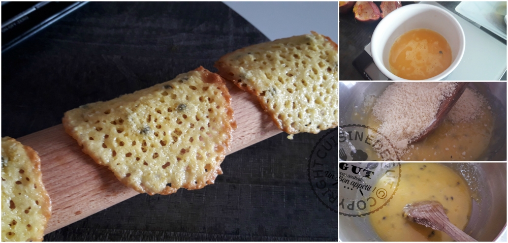 Ajourd’hui, je vous propose du sucré ! il y a un bon moment que je n’en ai pas publié. Il faut dire que je fais rarement des desserts, gâteaux et Cie.. J’attends d’avoir une occasion. On devient vite addict au sucré alors… Cette occasion s’est présentée dernièrement en recevant à déjeuner un couple d’amis. Pour décorer mon petit dessert que je vous proposerais plus tard, j’ai voulu faire des tuiles, c’est tellement bon. Pour changer un peu de la saveur orange que j’avais mise sur mon Mille feuilles en panna cotta aux fraises, j’ai choisi de les faire au jus de fruit passion. J’ai bien fait car elles ont bien plu mes petites tuiles ! C’est sûr qu’il ne faut pas mettre le nez dedans car je ne réponds plus de rien.. la boite risque d’y passer ! Voici une bien belle façon d’illustrer ce merveilleux fruit pour Cuisinons de saison !!