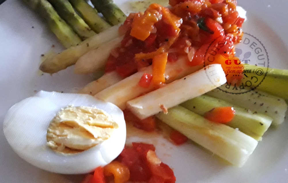 Humm!!! Les poivrons, « j’en mangerai sur la tête d’un pouilleux » comme on dit chez moi, lol!!! cette salade me plairait énormément, mais sans ail pour moi ! Avec les oeufs durs et les asperges ça doit être super! bon week-end Claudine! Bisous!