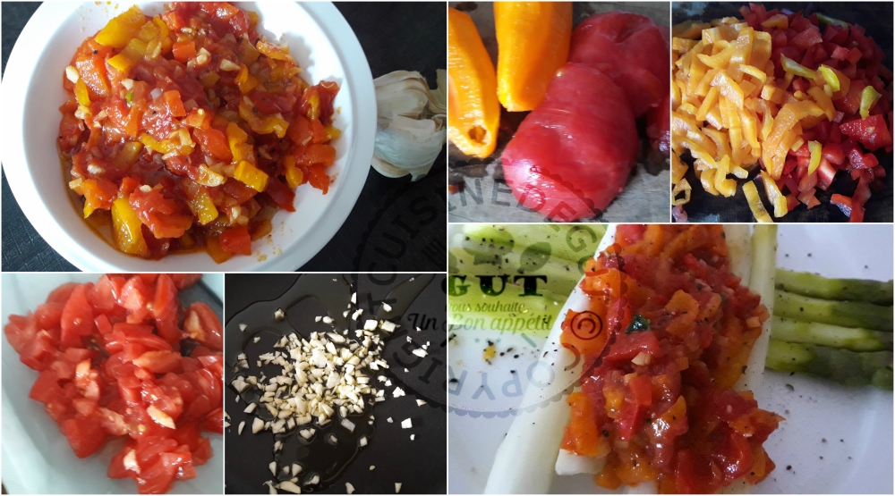 Tout ceci est grâce à la petite recette reprise sur le site de ma chère Samar (Mes inspirations culinaires). Cette salade Mechouia porte aussi le nom de Hmisse ou hmiss. C’est un peu nos chers poivrons marinés à l’huile et ail sauf que là il y a de la tomate en plus ! Je ne pouvais être que partante pour la faire, même si jétais en panne de poivron vert et qu’il a été remplacé par des poivrons oranges ! Comme je m’y attendais c’était franchement délicieux et du coup pour la terminer j’ai eu l’idée, pour remplacer une vinaigrette, de l’ajouter pour déguster mes dernières asperges ! Nous nous sommes vraiment régalés avec ce plat, tellement même que je referais cela tous les ans lorsque nous serons en pleine période des asperges !! mais il se pourrait bien aussi que je conserve quelque temps cette salade Mechouia dans un pot hermétique au frigo ! Je la verrais bien aussi en petite sauce avec viande et poisson !! Oui elle va devenir indispensable chez moi cette Salade mechouia !! Merci à toi ma Samar !