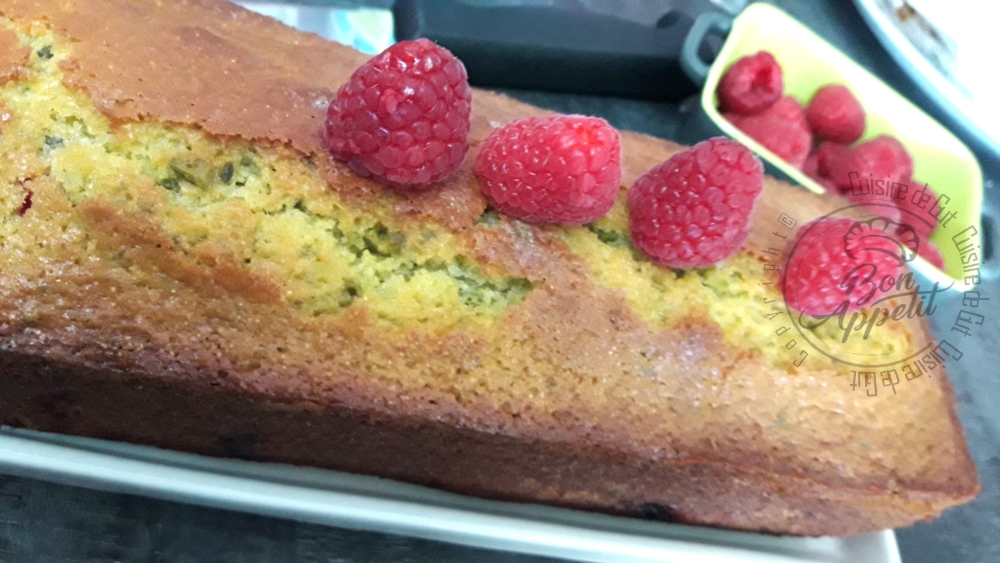 Published at 1000 × 563 in Cake framboises pistaches au fromage blanc et semoule