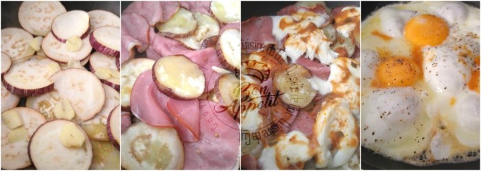 Published at 1000 × 356 in Oeuf au plat sur aubergine mozza et bacon