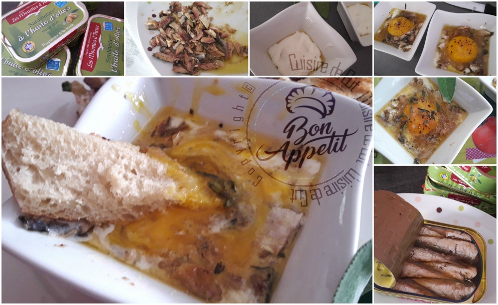 Je ne connaissais pas ces petites sardinettes qui s’appellent ainsi car elles sont toutes petites. Pour débuter, car j’espère pouvoir publier d’autres recettes avec ces bonnes petites sardinettes, j’ai voulu faire un petit plat que tout le monde aime. Je veux parler de l’oeuf cocotte ! On peut les faire avec toutes sortes de variantes alors pourquoi pas en oeuf cocotte ? Je me suis donc mise au travail et vous délivre ce petit plat que nous avons fort apprécié. De bonnes petites mouillettes sont venues accompagner cet oeuf et la saveur des petites Sardinettes Gonidec a fait de ce plat un véritable petit régal ! Ne vous étonnez pas de ne pas voir beaucoup de blanc sur les photos car j’en ai retiré une bonne partie, c’est le jaune le meilleur et dans le cas présent je voulais bien sentir les sardines 🙂 Alors si vous avez envie d’un plat facile à faire, peu onéreux mais très gourmand, n’hésitez pas à reproduire ce plat ! Trop bon ! Merci à Pierre pour la confiance qu’il me renouvelle tous les ans !!