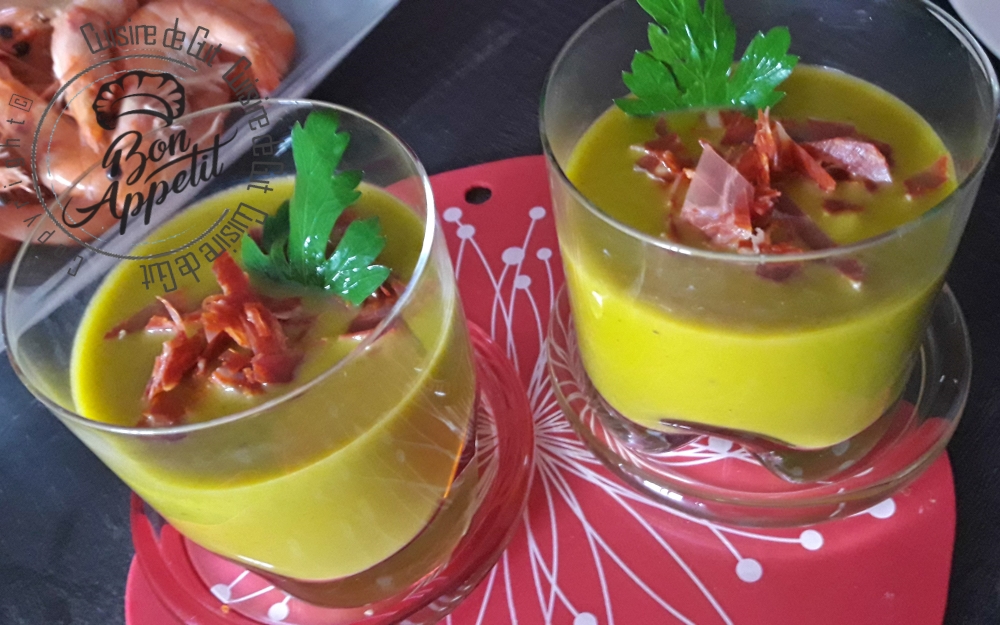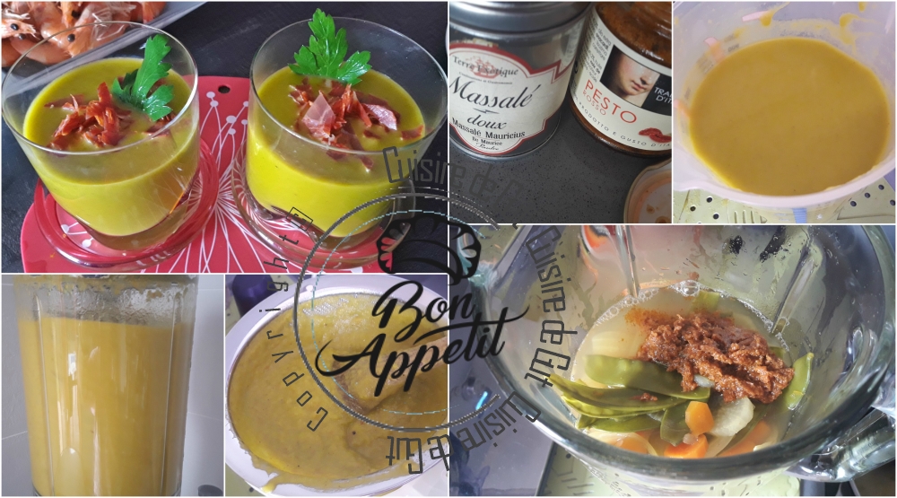 Séverine m’avait mis l’eau à la bouche seulement voilà je n’avais pas de petits pois sous la main. Du coup comme j’avais par contre des pois gourmands, en vue de faire un plat pour Cuisinons de saison, je me suis dit que ce devrait être pareil. Je n’en avais pas beaucoup. Environ 200 gr du coup j’ai associé à ce bon légume quelques carotte et un demi navet long. Vous me connaissez maintenant il me fallait un parfum ? j’ai choisi du Massalé et comme il me restait du pesto rosso que je voulais finir je l’ai également ajouté ! Les petits pois gourmands tout comme les cosses de petits pois je suppose, sont très fibreux, ce qui fait qu’il m’a fallu passer à travers une passoire, la préparation obtenue après mixage assez long au blender, mais que c’était bon !! J’ai servi cette petite soupe de belles crevettes roses, eh bien je vous assure que c’était un bon petit repas et tout cela grâce à la petite phrase de Séverine. Ce qui me fait dire qu’il faut toujours lire les petits textes mis en intro avant de laisser un commentaire !! Merci ma Séverine !! Ta belle idée de garder tes cosses m’ont faire faire une délicieuse soupe glacée très appréciée en ce moment !!