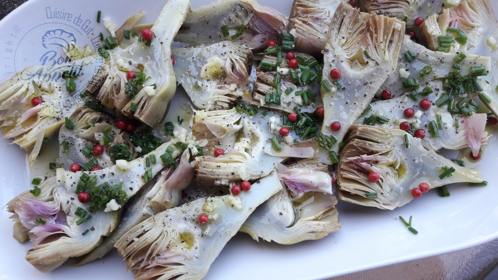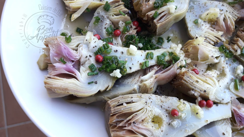 Je vous avais bien dit que le thème de l’édition #CataCookingChallenge07 de catalina dont Sophie est la marraine m’avait bien plu ! Voici encore une recette pour elles ! Après ma Frittata ausx fines herbes poivron et chèvre on repart en Italie avec des anti-pasti !! Je suppose que vous savez ce que c’est ? Tout un tas de petites préparations que les italiens dégustent avant leur pâtes journalières !! Un peu comme les tapas espagnoles mais sans le plat de pâtes derrière 🙂 Chez nous on les servira à l’apéro ou bien en entrée ! Je les ai personnellement servis en plat le soir, avec une belle tranche de jambon et bayonne et du melon, nous avons fait un petit repas estival très sympa !! Il ne faut pas que le fait de tourner des artichauts vous effraye. C’est en fait très facile à faire, je vous laisse en lien une petite vidéo que j’ai mis d’ailleurs sur cuisisons de saison (d’ailleurs profitez en pour visualiser les autres..). Et puisque je parle de cuisinons de saison je lui dédie ce plat !! Les artichauts sont de saison !! Que j’aime la cuisine Italienne ! je suis aux anges en ce moment avec tous ces petits plats que je leur pique !! Vous avez eu une chouette idée avec ce thème les filles, merci beaucoup !!