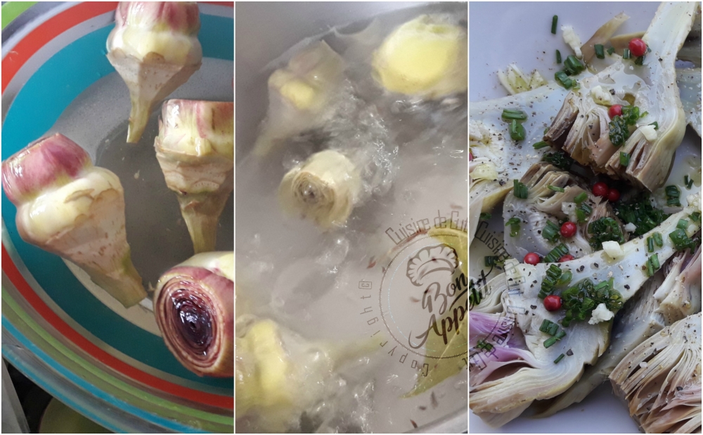 - Tourner les artichauts puis couper les extrémités en coupant le bout des feuilles (Video ICI)