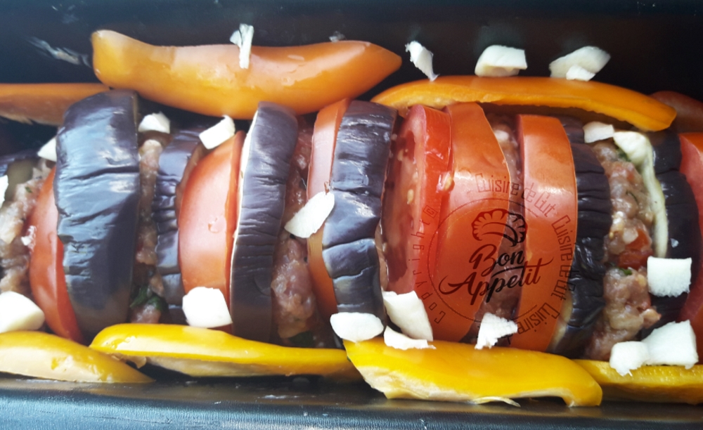 - Dans un moule à cake beurré, commencer à intercaler les petites tranches d’aubergines et de petites tomates puis une galette de viande