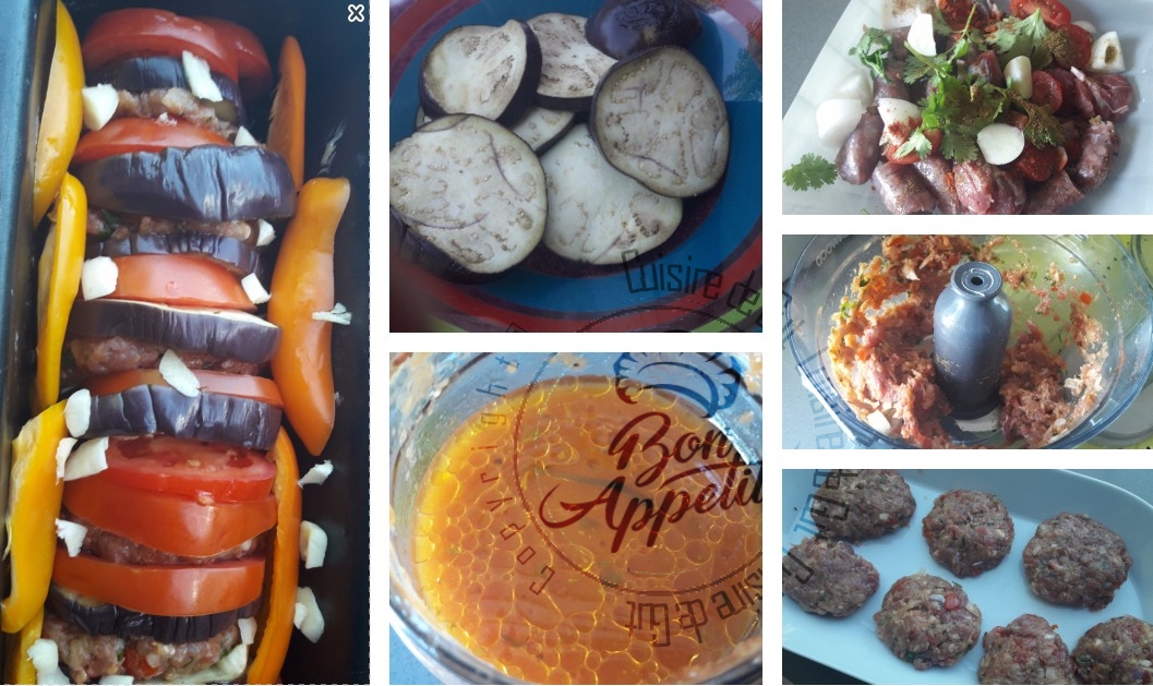 Dommage que mon amie Marlyzen (Marlyzen cuisine revisitée) ne publie pas plus souvent car qu’est ce que je salive lorsque je vois ces jolies photos !! Vous ne la connaissez pas ? courrez y vite car vous ferez comme moi j’en suis sûre ! Lorsqu’elle a publié son kebab qu’elle avait fait avec de la viande hachée de boeuf je me suis dit de suite dit : dommage qu’il y ait du boeuf ghaché ! je n’aime pas la viande hachée de boeuf si elle n’est pas saignante, avec de l’agneau ce serait tip top ! c’est d’ailleurs ce que j’ai dit à Marzylen dans mon commentaire. Ce plat me titillait et du coup j’ai regardé dans mon congélo si je pouvais trouver des morceaux d’agneau qui pourraient faire l’affaire. Je suis tombée sur deux tranches de selle d’agneau. Voilà qui pourraient faire l’affaire !! Elles n’étaient pas bien grosses, je lui ai donc ajouté 2 saucisses aux herbes, mis quelques épices, de l’ail de la coriandre fraiche et quelques tomates cerises pour faire ma farce. Marzylen préconisait ensuite de faire une sauce avec bouillon, un peu d’huile d’olive et du concentré de tomate. J’avais un reste de sauce tomate aux herbes (romarin, menthe, basilic et sauge), j’ai ajouté de l’eau pour la liquéfier et un peu d’huile d’olive. Comme à mon habitude j’ai d’abord fait pré-cuire mes rondelles d’aubergine au micro ondes pour diminuer le temps de cuisson. Ce plat était juste super bon ! tellement bon d’ailleurs que j’ai bien regretté ne pas en avoir fait plus ! Merci Marlyzen pour ce plat qui nous a franchement régalé et qui va venir illuster l’aubergine dans Cuisinons de saison !