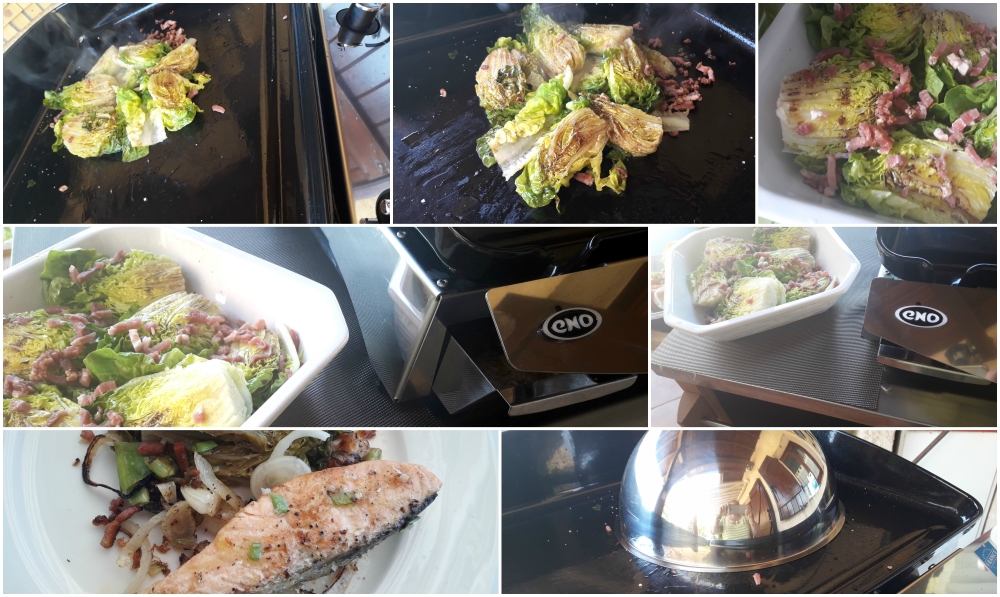 Pour en revenir à ce plat de poisson j’ai choisi comme accompagnement des sucrines ! Vous connaissez ? ce sont des petites salades de la famille des laitues. Elles sont petites de forme allongée et leurs feuilles sont assez épaisses. C’est en voyant celles de mon amie ou plutôt je devrais dire de notre amie sophie (La tendresse en cuisine) qu’elle avait grillées que j’ai pensé aussitôt qu’elles feraient un excellent accompagnement avec un poisson. Je ne les ai pas cuisinées de la même façon que sophie puisque je voulais les servir avec mon saumon et non seules, mais cuites ainsi sur ma plancha avec des petits lardons fumés, des oignons et arrosées d’huile d’olive et de vinaigre balsamique l’ensemble s’est révélé totalement délicieux ! Je suis vraiment contente d’avoir réalisé ce plat ! ça m’en fait un de plus à refaire de temps à autre et tout cela grâce à toi ma sophie ! Merci beaucoup