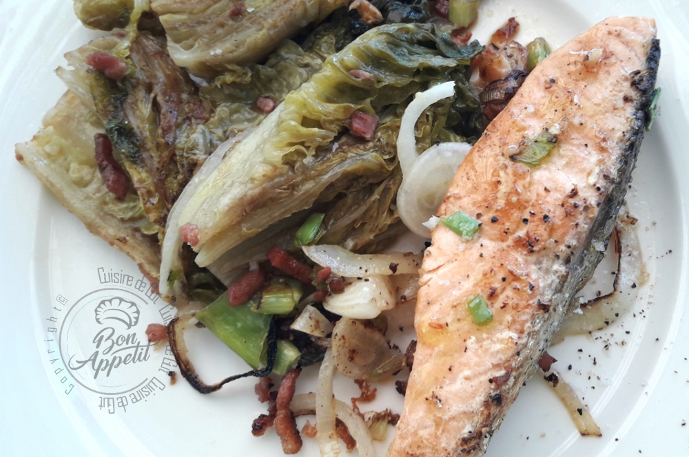 - Servir le saumon avec une portion de sucrine, quelques lardons et oignons
