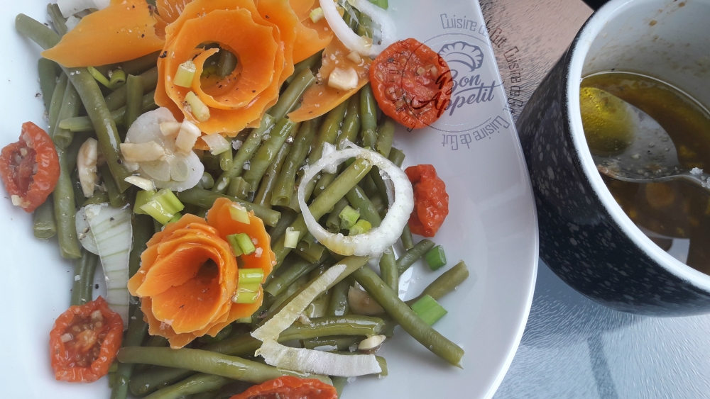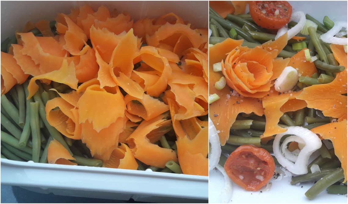 Aujourd’hui je vous propose un petit plat en salade tout simple mais fort délicieux. Facile et rapide à faire c’est tout à fait ce dont j’ai envie de en ce moment ! J’ai eu cette idée de plat avant mon absence et ça fait déjà 3 fois que je la refait ! Mon taille crayon qui sert à réaliser des légumes en rubans m’a bien servi, je me suis amusée à faire des petites fleurs de carottes. C’est joli non ? C’est de suite beaucoup plus appétissant vous ne trouvez pas ? Mes petites filles ont de suite adoré les dévorer ces jolies fleurs ! Une belle façon de manger sainement ! Les légumes étant cuits à la vapeur ils gardent de ce fait leur bon goût et tous leurs nutriments, je ne peux que vous conseillez d’en faire autant ! A refaire sans hésitation. En attendant je publie cette recette pour le Cuisinons de saison de septembre !!