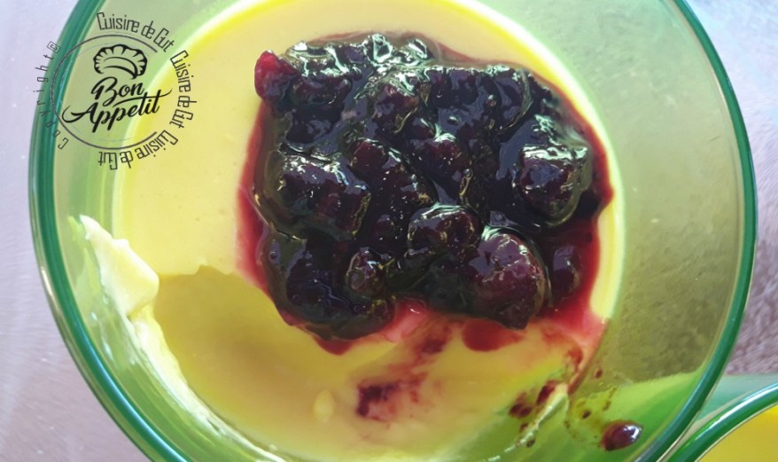 Comme je vous l’ai dit hier, j’ai réalisé 2 boites de sorbets aux fruits de la passion car d’une part il m’en fallait pas mal d’abord pour mon fils et sa compagne puis ensuite pour mes petites filles et aussi parce que de sachet de la purée de fruits fait 1 kg !! Malgré cela si vous comptez bien 350 gr x 2 = 700 gr, il me restait donc 300 gr de fruits. J’ai donc décidé qu’elle finirait en panna cotta ! C’est un petit dessert que j’aime faire car il est très rapide à faire et c’est franchement bon. J’avais des myrtilles. Je les ai fait cuire et j’ai ajouté cette purée de myrtilles sur le dessus ! C’était terriblement bon une belle association que ces myrtilles et ces fruits de la passion ! un bon petit dessert à mettre à mon actif pour terminer une purée de fruits (quelle qu’elle soit d’ailleurs !!) Je suis certaine que vous l’auriez apprécier ! en attendant c’est cuisinons de saison qui en bénéficiera !!
