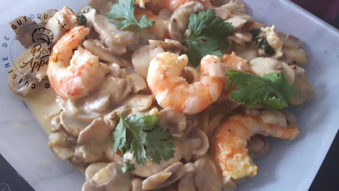 Published at 1000 × 563 in Crevettes et champignons au Rivesalt, coriandre et curry