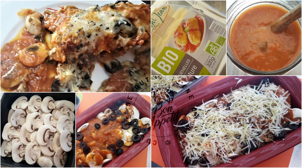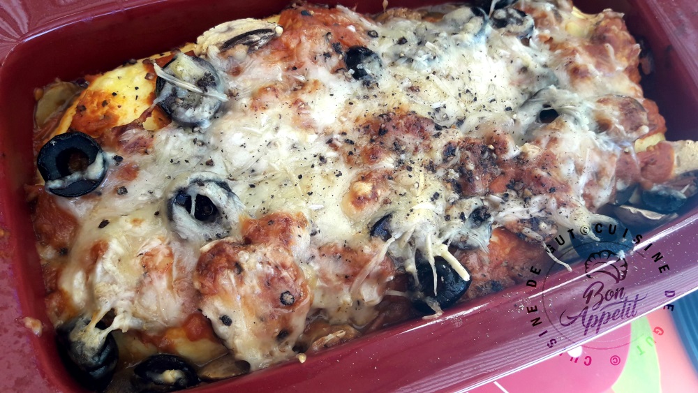Il y a tout de même de la sauce tomate mais elle était bien parfumée, aux épices et à la sauge ! Les champignons et les olives apportent une petite saveur supplémentaire ! merci Patricia ! bisous