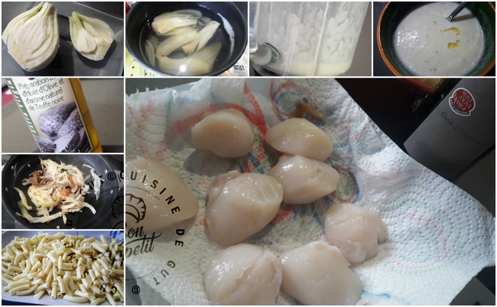 Vous devez peut être vous dire que je n’ai plus du tout envie de cuisiner car ces derniers temps je vous ai surtout proposé soit des plats faits avec des restes ou des gâteaux !! Que nenni rassurez vous ! Je suis toujours très attirée par des plats gourmands surtout au poisson et lorsque je vois notamment des plats comme celui proposé par mon amie Sylviane (Les vagabondages de Viane) qui me fait souvent l’amitié de proposer des plats pour cuisinons de saison, je craque littéralement ! Je venais d’acheter justement des Noix de St-Jacques que je comptais garder pour les fêtes, mais je n’ai pas pu attendre je voulais à tout prix goûter ce plat ! Cette crème de fenouil à l’huile de truffe me tentait beaucoup. J’aime son parfum puissant mais il faut se méfier du dosage car autant c’est délicieux lorsque c’est bien dosé, autant on peut gâcher un plat si on en met de trop. J’ai aussi vraiment un faible pour les Noix de St-Jacques et seul leur prix, qui est devenu assez important même chez moi, me retient d’en faire plus souvent ! Je comptais en acheter 8 par 8 pour que cela me fasse moins cher d’un coup pour Noël, c’est raté !! Que j’ai aimé ce plat ! qu’est ce que c’était bon ! J’ai présenté ce plat sur un lit de pâtes comme l’avait fait Sylviane mais pour faire une entrée pour les fêtes, les présenter dans des coquilles sur le lit de fenouil caramélisé ce serait bien suffisant ! Je crois bien que je tiens mon entrée pour mon repas de Noël et ceci grâce à toi Sylviane ! Merci beaucoup !!
