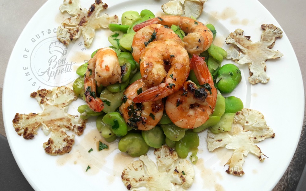 Choisir de très belles crevettes bien grosses !! Manipuler les tranches de chou fleurs avec précaution pour ne pas qu’elles se brisent, elles doivent rester légèrement croquantes et être à peine dorées.