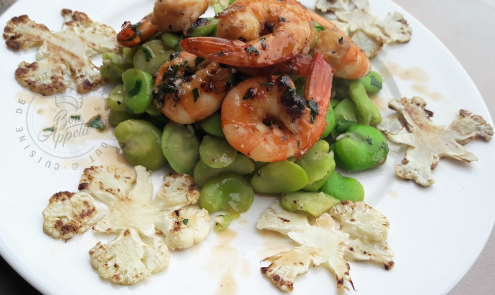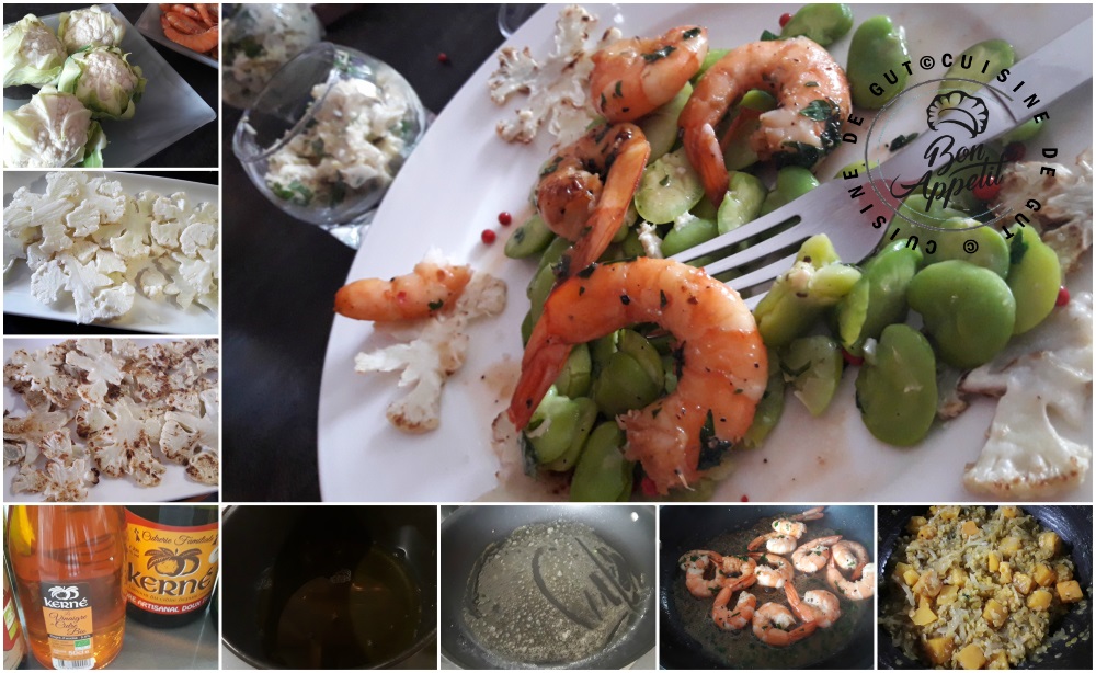Pour poursuivre l’opération proposée par Cuisine à l’ouest qui est de participer à une opération en partenariat avec la cidrerie Kerné en proposant des plats cuisinés à base de cidre ou de vinaigre de cidre, j’ai pensé, comme j’adore les crevettes, d’en cuisiner au cidre, ou plus exactement avec une réduction de cidre. Pour changer j’ai choisi le cidre doux. J’avais acheté cette fois, pour vous faire plaisir, vu que vous aviez bien aimé mes mini choux verts, des petits choux fleurs en accompagnement et comme j’adore les fèves en vinaigrette, j’ai complété cet accompagnement de choux fleurs qui était un peu juste, d’une petite salade de fèves en utilisant le vinaigre de cidre Bio offert lui aussi par la cidrerie Kerné. Cette petite réduction de cidre m’a servi de marinade pour mes crevette avant de les faire sauter dans un beurre noisette. Bien poivrées pour leur donner un peu de pep’s elles ont gentiment caramélisées avec cette réduction de cidre que j’ai ajoutée ! C’est plutôt joli non ? J’aime les plats qui ont de l’allure mais l’essentiel est que c’était surtout très très bon !! J’espère que ce plat sera autant apprécié que nous l’avons été car c’est une super façon de cuisiner la crevette. Elles avaient beaucoup de goût avec ce bon cidre. J’avoue aller de découverte en découverte moi avec ce cidre !
