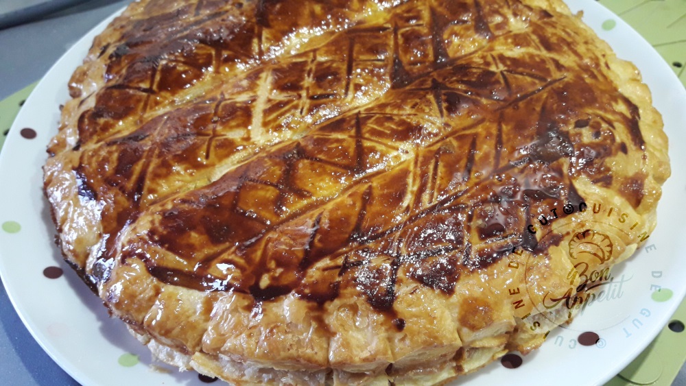 C’est avec un peu de crainte que j’ai réalisé cette galette. J’ai même cru à la cata car comme une andouille j’ai d’abord étalé le caramel et la crème d’amande sur la pâte avant de la découper avec un cercle (normalement je fais l’inverse) ce qui fait qu’ensuite je n’ai pas pu la couper avec mon cercle qui était plus petit que la garniture étalée ! J’ai donc pris mes ciseaux mais du coups elle est moins jolie car il y avait du caramel sur les bords et il sans doute empêché un peu que le feuilletage se fasse mieux. Normalement il faut juste pincer les bords simplement humidifiés. Si le résultat n’est pas beau beau beau, le goût était excellent. Je n’ai pas trouvé la fève et mon mari non plus ! ce sera pour la 2ème fournée car malgré notre envie nous n’en avons mangé que la moitié !! A refaire cette petite galette elle est fameuse !