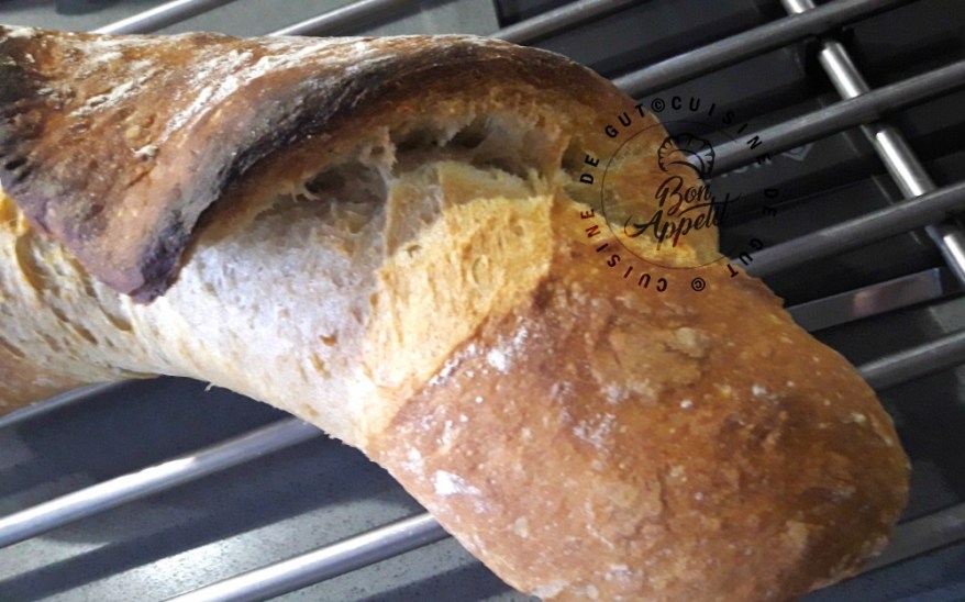 Ne faites pas l’impasse du Bassinage pour ce pain car il a participé sans aucun doute à sa réussite !! Si vous avez suffisamment de temps devant vous réaliser 4 rabats sinon vous pouvez le raccourcir à 3. En ce qui concerne la cuisson ça dépend des fours, préchauffer le four à 240° puis baisser à 220° deès que vous enfournez. A vous de voir s’il faut ensuite baisser ou pas à 210° si vous voyez votre pain dorer trop vite. Sinon laisser à 220°. Allonger le temps de cuisson si votre pain n’est pas suffisamment doré. 5 minutes avant la fin de la cuisson retourner votre pain pour que le dessous puisse dorer aussi !