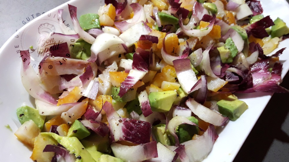 Je le dis souvent il me suffit de voir une petite recette pour que ça fasse aussitôt tilt dans ma tête ! C’est ce qui est arrivé lorsque ma très chère amie Laurence (Plaisir et équilibre) a publié sa petite salade d’endives kaki et haddock. J’étais sous le charme comme souvent ! Je venais justement d’acheter du haddock pour le faire avec des pommes de terre. Ca tombait bien pourquoi ne pas faire cette salade à la place ? Certes je n’avais pas d’endives non plus mais de belles carmines qui sont un croisement entre l’endive du Nord et la Chioggia, chicorée italienne. J’en achète de temps en temps pour faire justement des salades avec. Pas de Kakis non plus mais comme je l’avais dit à Laurence je ne suis pas fan de ce fruit. Par contre d’avocat oui. Du coup mon petit repas du soir était tout trouvé ! Et puis comme je fais une entière confiance à Laurence je savais que ce serais excellent ! Ce fût le cas, nous l’avons tellement apprécié que c’est l’entrée que j’ai faite dimanche dernier. J’avais mes neveux à manger et ils l’ont très fortement appréciée eux aussi !! Pour qu’elle soit plus goûteuse j’ai utilisé la fin de ma bonne huile d’olive goût à l’ancienne des huileries Richard snif snif ainsi que le vinaigre de cidre Bio Kerné dont il ne me reste plus qu’un fond. Voilà une entrée que je referais souvent l’hiver ou même comme cette fois là carrément en plat du soir. C’est vraiment vraiment joli avec toutes ces couleurs et c’est fameux. Comme les ingrédients ne sont pas tout à fait les mêmes que la petite salade de Laurence je dédie cette super salade à cuisinons de saison ! Merci Laurence pour m’avoir soufflé l’idée de ce délicieux plat !!