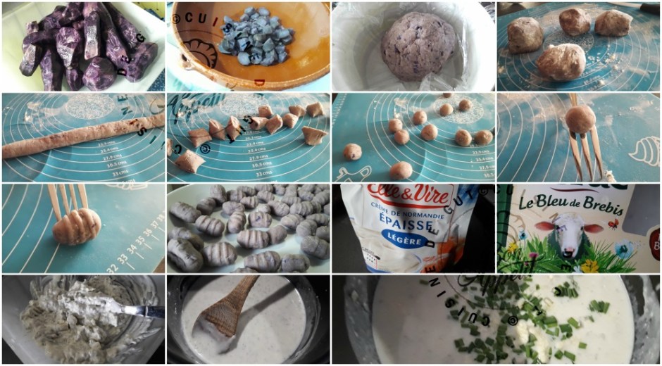 Je n’ai pas salé les gnocchis à cause de la sauce ! le bleu l’est pas mal, mais goûtez et rectifiez si vous le souhaitez ! Bien fariner le plan de travail lorsque vous réalisez les gnocchis. Les gnocchis ne doivent pas coller sinon ajouter un peu de farine pour pouvoir  appuyer dessus avec la fourchette sans que les gnocchis ne collent à la fourchette !!  Nettoyez la dès qu’il y a un peu de gnocchis dessus. Vous pouvez aussi une fois les boules réalisées les placer au frais pendant une heure avant de faire les stries, ce sera plus facile. Et puis et surtout : SE SERVIR D’UN PRESSE PUREE ! la pâte sera bien moins collante qu’au mixeur et bien plus facile à travailler ! J’ai complètement oublié de les faire rissoler quelques minutes après leur cuisson dans l’eau !! Ne faites pas comme moi et ne faites l’impasse de l’étape 21 !