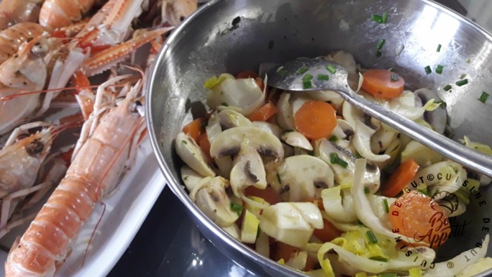 Langoustines vapeur à la sauge et salade aux légumes cuits et crus