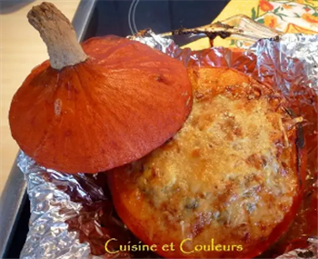 Vient ensuite ma très chère Irisa (Cuisine et couleurs) qui, attirée par mes Champignons farcis à la purée de potimarron et prociutto , a eu l’idée de génie, n’ayons pas peur des mots ! de faire l’inverse ! Elle a farci un potimarron avec des champignons et du prociutto !! C’est pas super ça ? J’ai été carrément bleuffée sur ce coup là ! Trop forte Irisa merci à toi !