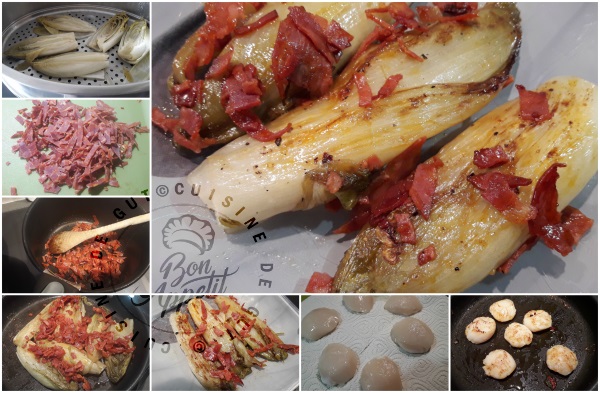 Lorsque je fais des noix de st jacques, je n’achète pas de coquille St jacques. Je ne sais pas si j’arriverais à les ouvrir, alors je les achète chez mon poissonnier déjà  prêtes. Ce jour là elles étaient superbes sans corail que je n’aime pas sauf en sauce. Elles étaient bien trop belles pour passer à côté. Je fais toujours ainsi dès que j’en vois de belles (et de pas trop trop chères) j’en achète et si je ne les fais pas de suite je les congèle comme ça j’en ai toujours sous la main et je peux donc assouvir ma gourmandise, c’est que je les aime ces noix de saint jacques que j’appelle parfois demoiselles de la mer  !  Du coup lorsque mon amie Michèle (croquant fondant gourmand) a publié son plat d’endives braisées et chorizo qu’elle avait fait avec ces fameuses noix de saint jacques, j’ai de suite eu envie de le faire ! J’ai toutefois fait précuire mes endives dans mon cuiseur vapeur Magimix puis j’ai poursuivi la cuisson des endives avec un filet d’huile dans une poêle.