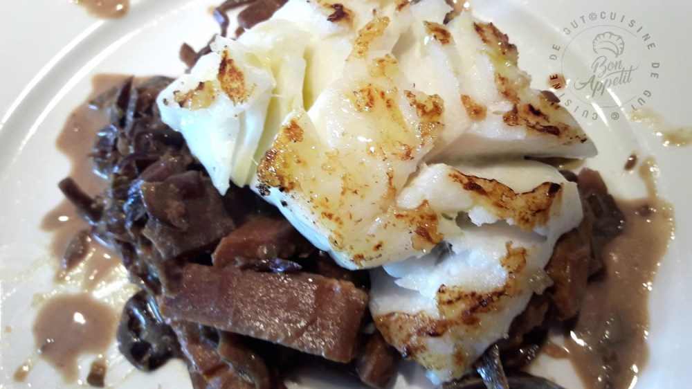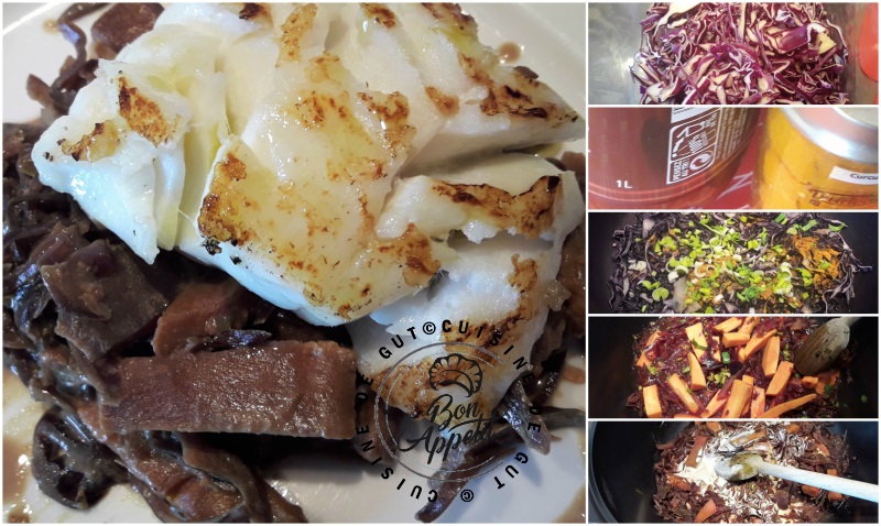 Dans le Lot où habite mon fils, il est très courant que l’on nous serve un petit ratafia en apéritif. Je n’en connais bien sûr pas la recette exacte mais je sais qu’il vient d’un assemblage de moût de raisin fraîchement pressé et d’eau de vie. Il a un goût sucré fait d’arômes de fruits rouges et servi très frais c’est très bon. Il m’en restait l’autre jour un fond de bouteille et j’ai eu l’idée d’y fait cuire mes légumes avec. Me rappelant de mon cabillaud au chou rouge à la bourguignonne qui nous avait bien régalé, j’ai eu envie de faire avec un plat avec un reste de chou rouge (dont la quantité est toujours trop grosse pour nous deux) et une demie patate douce cuits dans du ratafia. J’ai donc fait cuire tout ça avec du curcuma et une tige d’aillet et j’ai présenté un beau dos de cabillaud grillé à la poêle avec. Peu commun non ? Enfin vous avez l’habitude je crois mes recettes de cabillaud sont assez originales, enfin c’est vous qui le dites !!