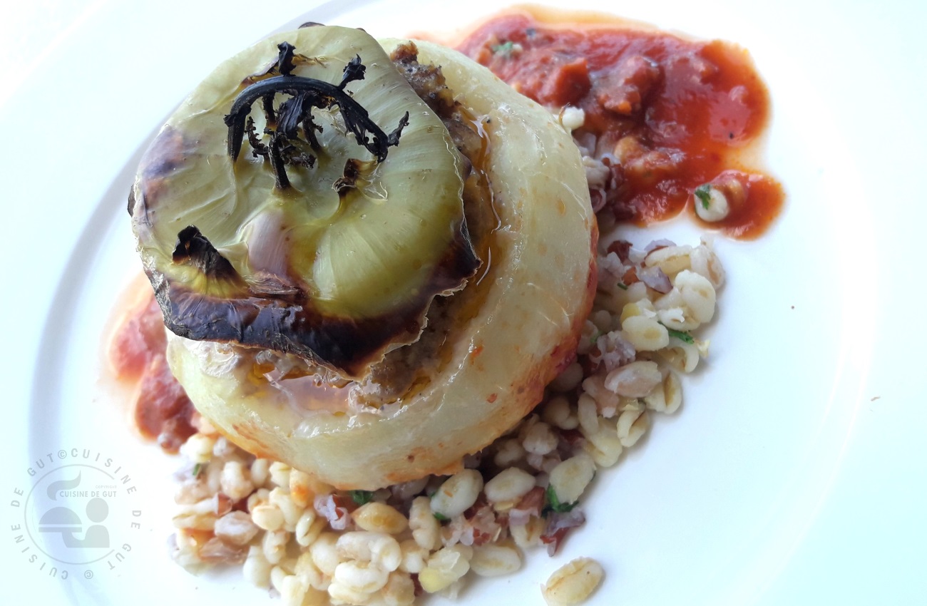 CHOU RAVE FARCI D’AGNEAU A l’HOUMOUS SUR LIT DE CEREALES