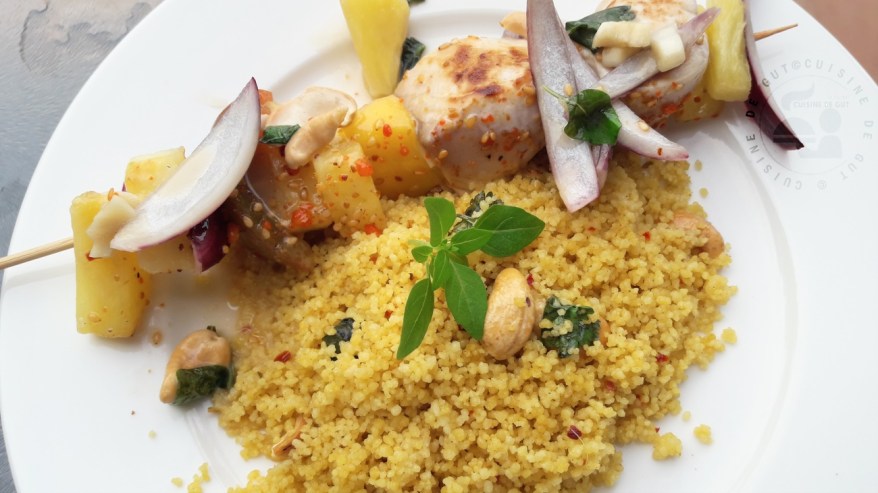 Heureusement que j’avais ce grill pour remplacer ma plancha car il aurait été vraiment dommage que je ne puisse pas réaliser ce plat ! Tout s’est marié à merveille. Un plat sucré salé au bon goût de coco avec un peu de croquant grâce aux noix de Cajou, accompagné de cette semoule bien épicée, donc de bonnes saveurs en plus je vous assure que c’était excellent ! voilà encore un plat vraiment pas compliqué à faire, qui peut être préparé à l’avance et qui a enchanté nos papilles C’est un plat très original que vous pouvez proposer à vos convives si vous avez la chance d’avoir beau temps ce sera encore plus chouette de le déguster en terrasse ! en attendant moi c’est avec plaisir que je le soumets à cuisinons de saison !