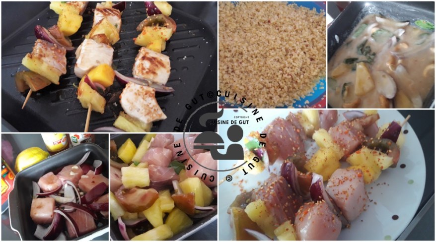 Allez je poursuis ma petite série de plats de poisson ! (vraiment désolée pour ceux et celles qui n’aiment pas) Je vous propose aujourd’hui des petites brochettes d’Espadon que je comptais faire cuire sur ma plancha Eno mais le temps en a décidé autrement. J’ai fait mes photos dehors mais comme on peut le voir en haut à gauche de la photo la table est mouillée !! Je les ai donc faites griller à la maison. Pour qu’elles soient bien savoureuses j’ai décidé de faire une petite marinade à base de sauce soja, sauce aux nems ail et oignon rouge et j’ai monté mes brochettes avec des cubes de mangue et ananas, qui pourraient être remplacés par des morceaux de pêches elles arrivent sur nos étals. Je me suis enfin servie de la marinade pour faire une sauce avec du lait coco et noix de cajou et en accompagnement le fait de faire une semoule épicée ma paru judicieuse.
