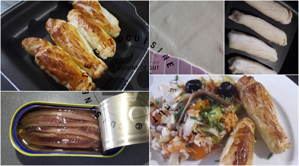 J’aime beaucoup les anchois contrairement à beaucoup de personnes, alors je n’ai pas mis un anchois mais trois à l’intérieur de chaque bâtonnet comme ça on sentait mieux les anchois. J’avais servi avec, une petite salade de riz et légumes complétées d’olives de Nyons. Le repas était complet gourmand et je ne me suis pas cassé la tête ! Si tu as d’autres petites idées comme ça Emeline, je suis preneuse ! je me suis bien régalée grâce à celle-ci ! un grand merci