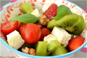 Enfin je terminerais par mon amie Laurence ! (Plaisir et équilibre) comme d’habitude !!! Laurence est vraiment ma plus grande fidèle ! merci merci Laurence pour cette fidélité toujours reconduite. Toujours très séduite par les salades sucrées salées elle a choisit ma salade de fraises, kiwis tomates et chèvre au basilic.