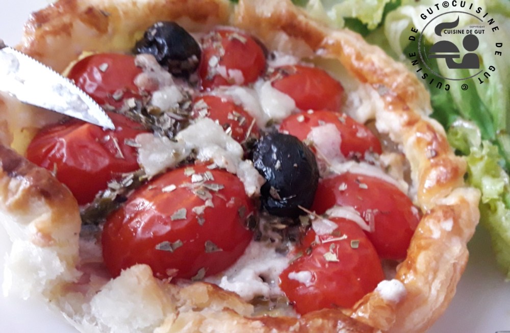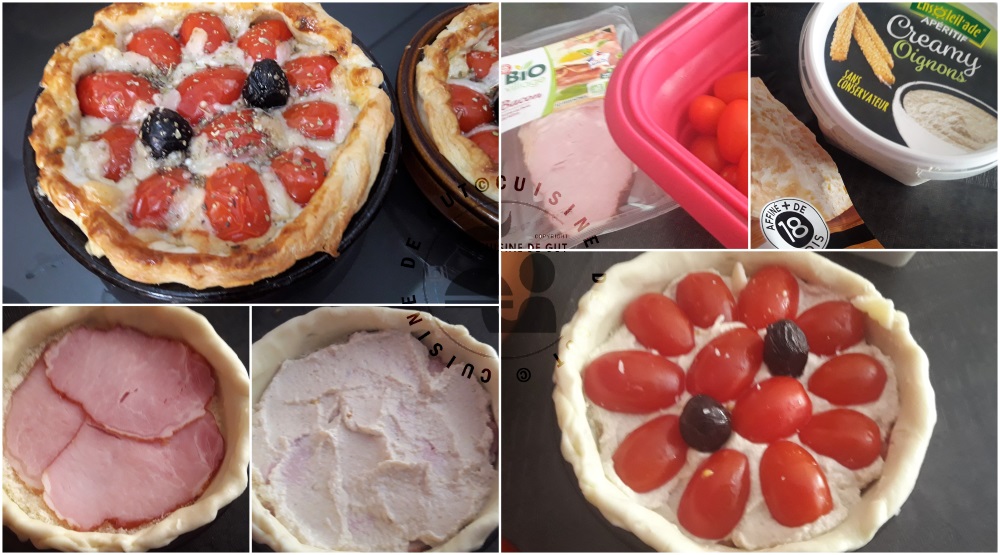 J’ai fait ces petites tartelettes lors de la demie finale du foot. Un melon pour commencer une petite salade, un repas vite fait pour être prêts pour le match à 20 h. C’est mon amie Michèle (Croquant fondant gourmand) qui m’a donné envie d’en manger car la sienne était si tentante mais je n’avais pas ce qu’il fallait pour faire la même chose. Alors du coup, je les ai réalisées avec ce que j’avais en ma possession. J’avais acheté un pot de crème d’oignon de la marque Ensoleillade que je voulais essayer en vue d’apéro lorsque les enfants seraient là. J’ai trouvé que c’était l’occasion pour voir ce qu’elle donnait. Il me restait quelques olives de Nyons des huileries richard, c’était l’occasion de les terminer et un bon bacon Bio que j’aime beaucoup. En fromage du parmesan, à la fois râpé directement sur la pâte pour absorber le jus éventuel des tomates et en brisures sur le dessus et de l’origan pour parfaire le tout.