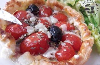 Tartelettes de tomate parmesan sur lit de bacon et creme d’oignon