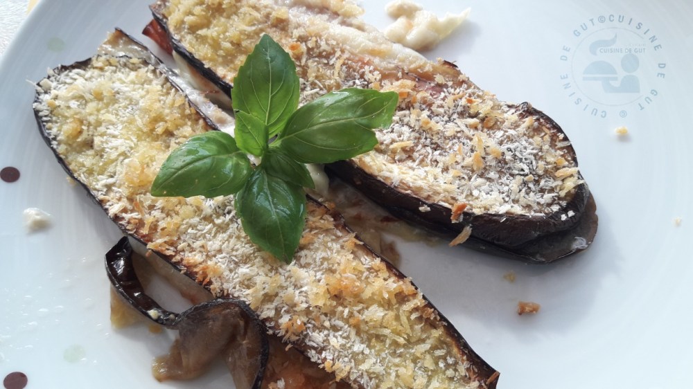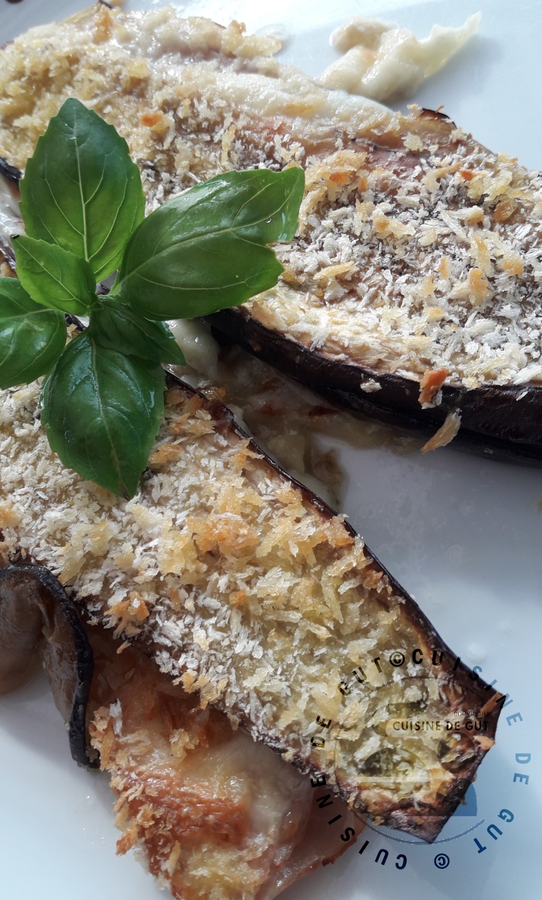 Vu mon amour pour les aubergines je ne pouvais pas laisser passer la recette de mon amie Mie (Miechambo cuisine) qu’elle avait appelée Côtelettes d’aubergines panées lorsqu’elle l’avait gentiment dédiée à Cuisinons de saison. C’était rigolo comme titre. En fait il s’agissait de mettre du jambon et du fromage (Mie avait choisit le Provolone) entre deux tranches d’aubergines et de les paner après les avoir roulées dans l’oeuf et de la chapelure. Moi j’ai choisis du Prosciutto Cotto et des tranches de bacon et j’ai intercalé des tranches de mozza.