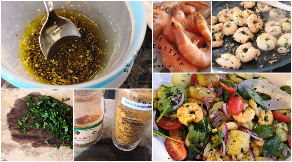 Lorsque je fais une salade de pommes de terre j’ai pour habitude de la servir avec de la truite fumée. Je n’ai jamais cherché comment les faire autrement. Ah ! ces habitudes ! mais heureusement les amies sont là et c’est en voyant la belle, que dis-je la magnifique salade de mon amie Malika que je me suis rendue compte que je pouvais fort bien mettre des crevettes à la place ! Son blog Cuisine culinaire n’arrête pas de me faire saliver avec ses superbes photos alors en voyant ces crevettes, je me suis dit que c’était tout de même un monde que moi la super grande fan de crevettes je n’ai encore pas songé à les mettre dans une salade de pommes de terre !! J’ai, bien sûr, fait les choses un peu à ma façon selon mon habitude, déjà en faisant cuire mes crevettes avec un peu d’huile d’olive, avec une persillade et des épices espagnoles et du piment d’espelette, et d’autre part en y ajoutant des pousses d’épinards et ma vinaigrette préférée.