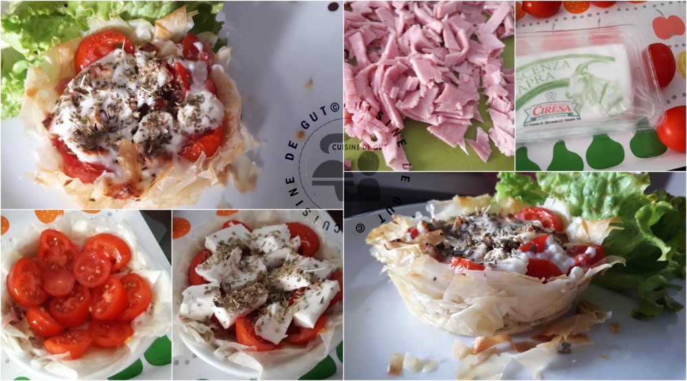 Avant de partir il fallait bien manger et je n’avais plus grand chose dans le frigo. Comme j’avais réalisé dernièrement des petits roulés croustillants aux épinards et haddock, il me restait des feuilles filo. Ca irait très bien pour notre dernier repas. Je les avais bien enfermées sous vide pour qu’elles se conservent. Je l’avais déjà fait et c’était super mais là lorsque j’ai ouvert le paquet et que j’ai voulu les prendre, je me suis vite rendue compte que ça allait être compliqué de faire des roulés croustillants ! je n’avais que des morceaux. Plus une feuille entière. Mince ! J’avais du retirer trop l’air et je les avais abimées. Bon pas de panique, si je mets les morceaux dans des petits plats allant au four, ça devrait le faire non ? Du coup j’ai fait comme des petits nids en utilisant des tomates du jambon et un morceau d’un fromage trouvé à Grand frais que je ne connaissais pas et qui ressemblait un peu à la mozzarella mais avec un goût de chèvre.