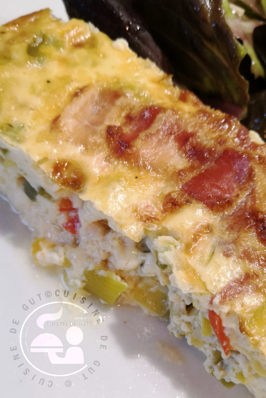 Je n’avais encore jamais associé poireaux et poivrons dans ma cuisine. Peut être parce que j’adore ces deux légumes, je ne sais pas car j’associe plus souvent un légume que j’adore avec un autre que j’aime moins mais l’idée ne m’étais jamais venue. C’est pourquoi lorsque j’ai vu, parmi ses succulentes recettes, le flan de mon amie Delphine (Oh la gourmande) j’ai de suite flashé ! Elle avait même prévu d’y ajouter un peu de protéine avec de la pancetta, trop forte Delphine. Que tout ceci me semblait bon. J’ai juste ajouté un peu de crème d’oignons dans mes oeufs et du comté en râpé et je l’ai servi avec une bonne petite laitue roussette bien fraîche !