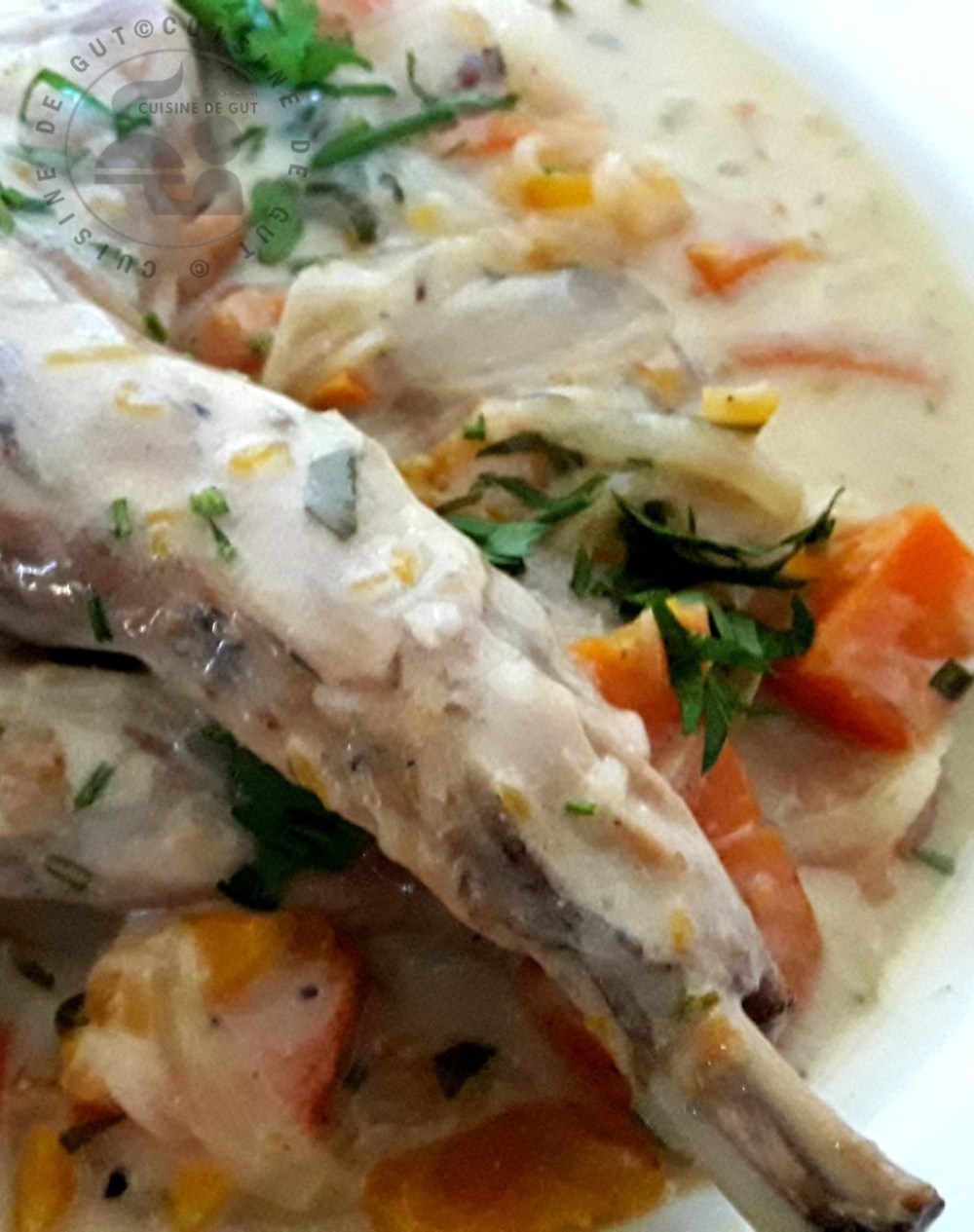 Comme j’ai eu raison de faire ce plat ! En bonne mère sauce que je suis, j’ai adoré cette sauce, elle était divine ! avec un bon pain frais j’avoue en avoir abuser !! Encore un plat de lapin coup de coeur. Surtout avec des gigolettes, seul morceau à mon goût car je l’aime moelleux ce petit lapin ! Voici un beau plat pour illustrer la Butternut de Cuisinons de saison !