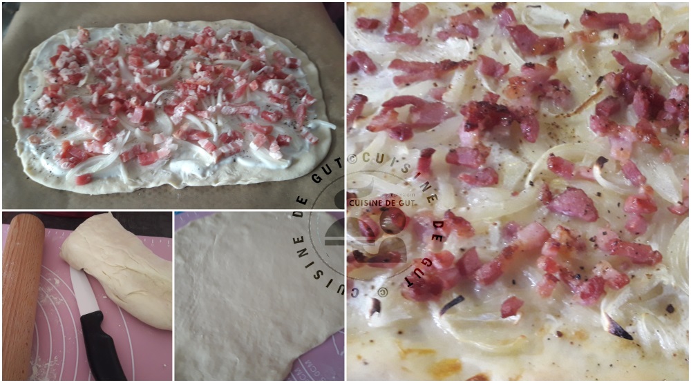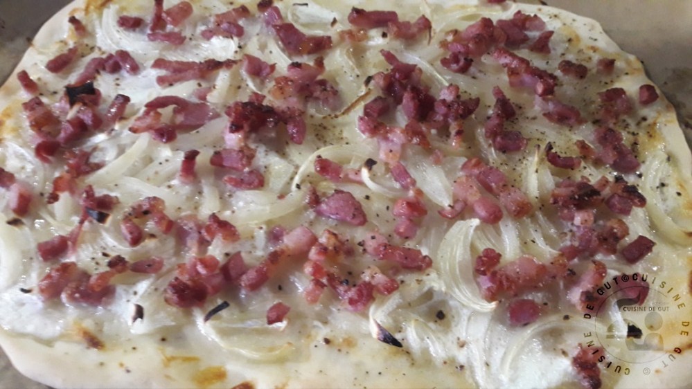 - Répartir sur le dessus les oignons et les lardons.