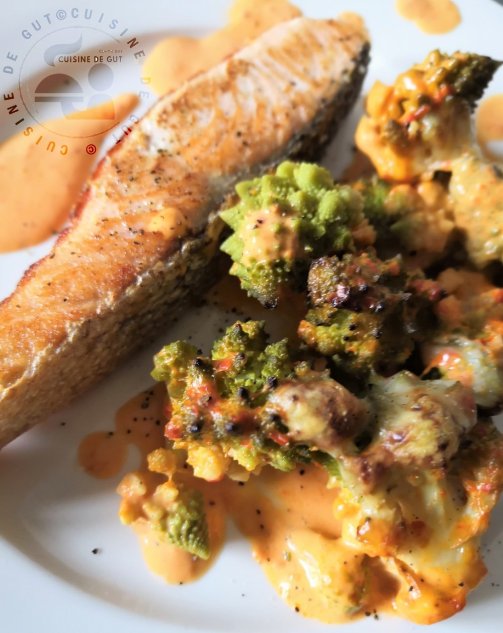 J’ai hésité à faire le tout au cuit vapeur mais la gourmandise a remporté sur le côté raisonnable ! Du coup j’ai fait simplement fait cuire le chou à la vapeur puis j’ai fait un petit gratin après, j’ai fait griller mon saumon, en prenant soin de le laisser encore rosé à l’intérieur et je peux vous dire que j’ai adoré ce plat ! Comme j’ai raison de tout osé pour cuisiner le poisson, il se prête à tout ! En ce moment je vois plein de recettes de couleurs orange alors même si je ne participe pas au jeu, je trouve qu’il est bien dans le thème !